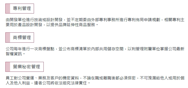 規劃三大策略方向並持續推動具體執行措施;首先,為建立完整的智慧財產保護機制,公司辦理智慧財產權訓練課程,以強化員工智慧財產觀念,並同步建立各部門之智財管理制度,透過制度化運作,以保障創新研發及創新服務所產生的具體成果。其次,本公司積極整合內外部資源投入創新研發,並已建立研發設計管理制度與委外研發管理制度,以強化創新成果之產出效率與智慧財產保護機制之落實。