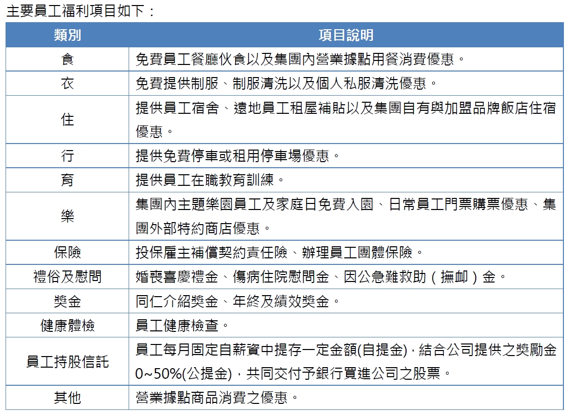 為促進勞資和諧,滿足員工在工作、生活安全、健康之需求及凝聚員工向心力,並保障員工權益及整體利益,除依法令規定為員工投保勞、健保外,也設置職工福利委員會,每月依法提撥福利金,推動各項職工福利措施。
